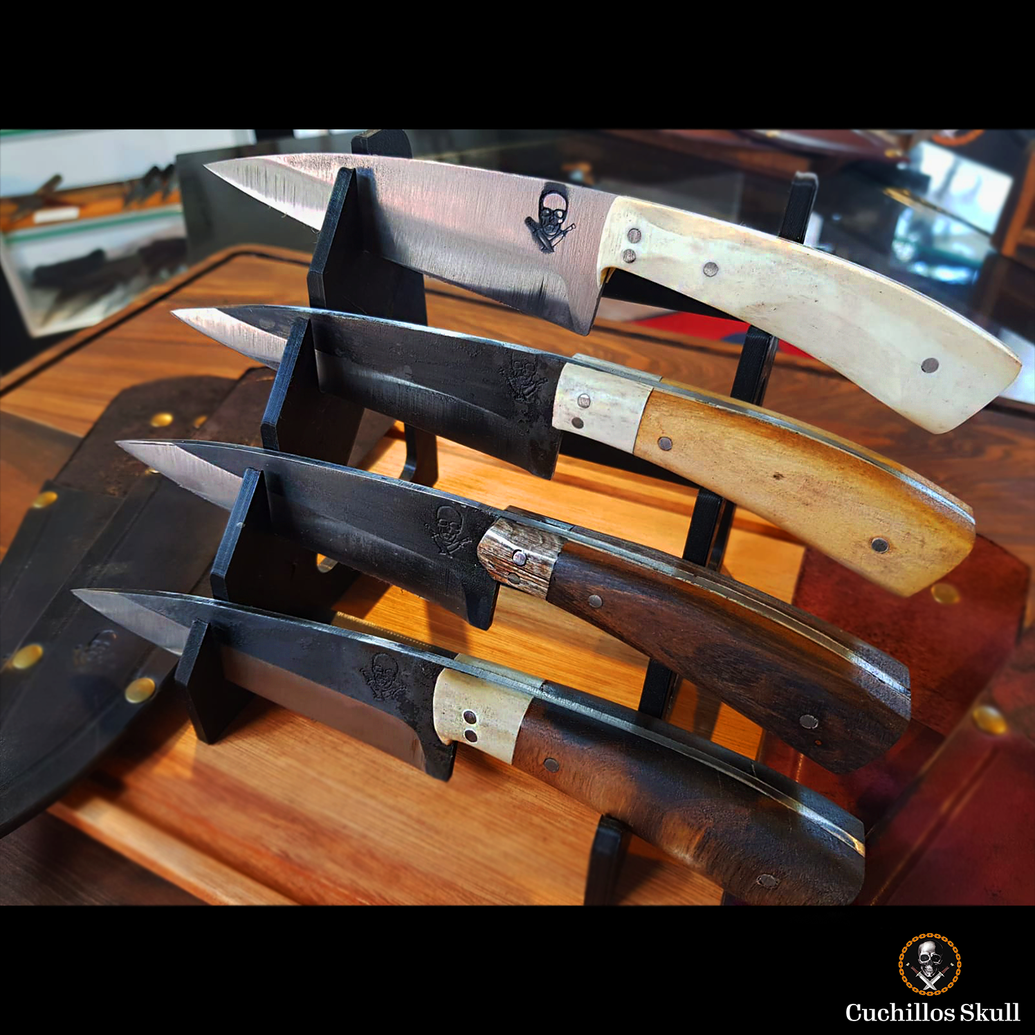 Hechos en acero inoxidable 498. Hoja de 10 cm de largo en full tang (espiga enteriza) de 2,85 mm de espesor. Cachas varias combinadas: guayubira, rabo, ciervo, vaca, y más.